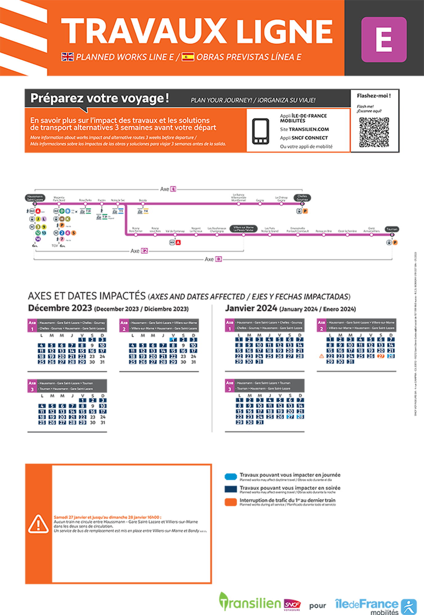 Retrouvez le calendrier travaux bimestriel de la ligne E et du tram-train T4 pour les mois de décembre 2023 et de janvier 2024.