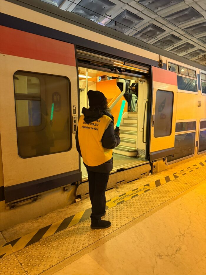 Donc ce que nous avons fait concrètement, c’est mettre de nouveaux dispositifs en place, avec des gestionnaires de flux ou régulateurs de flux, qui sont là pour faciliter l’accès au train pour nos clients. Donc ils sont sur les quais, devant les portes, avec des bâtons lumineux, qui changent de couleur, vert ou rouge, selon si la voiture est saturée ou pas. Et leur mission principale consiste à répartir les voyageurs sur toute la longueur du quai, avant l’arrivée du train, pour éviter les regroupements devant certaines voitures et optimiser la montée des voyageurs.