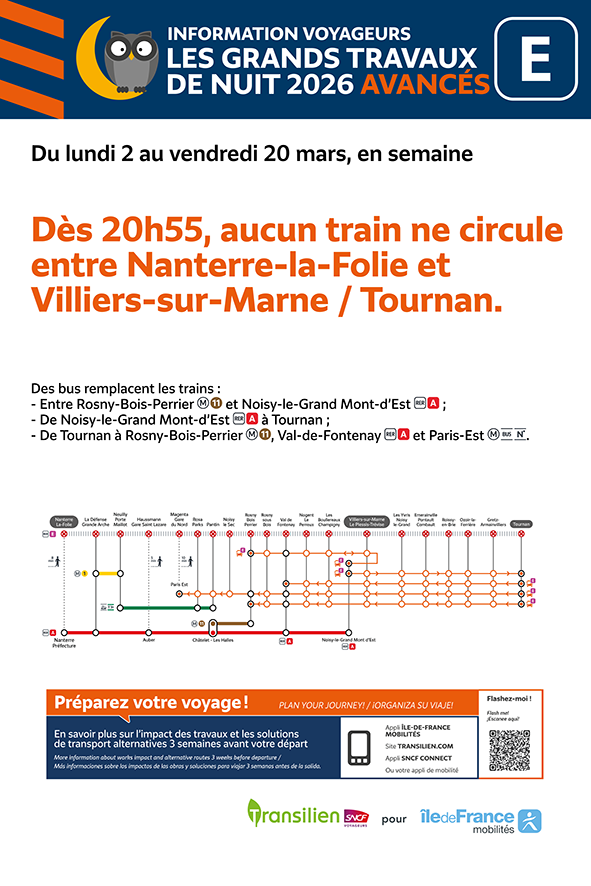 Les grands travaux de nuit sont avancés et aucun train ne circule entre Nanterre-la-Folie et Villiers -sur-Marne et Tournan à partir de 20h55