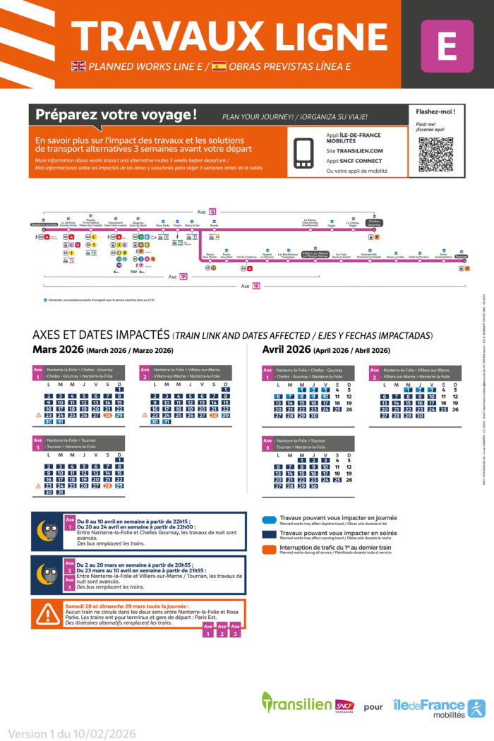 Retrouvez le calendrier bimestriel de la ligne E pour les mois de mars et avril 2026.